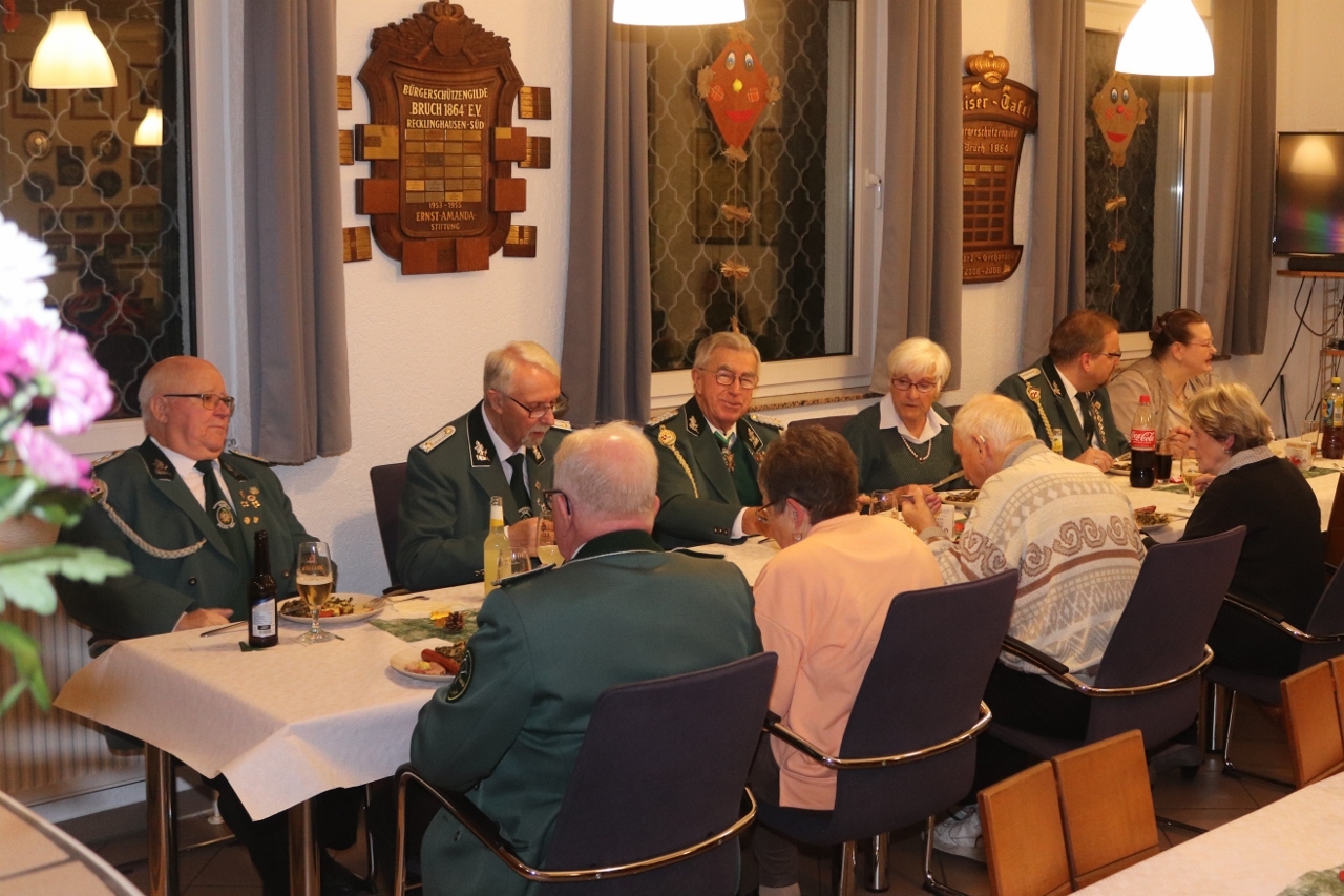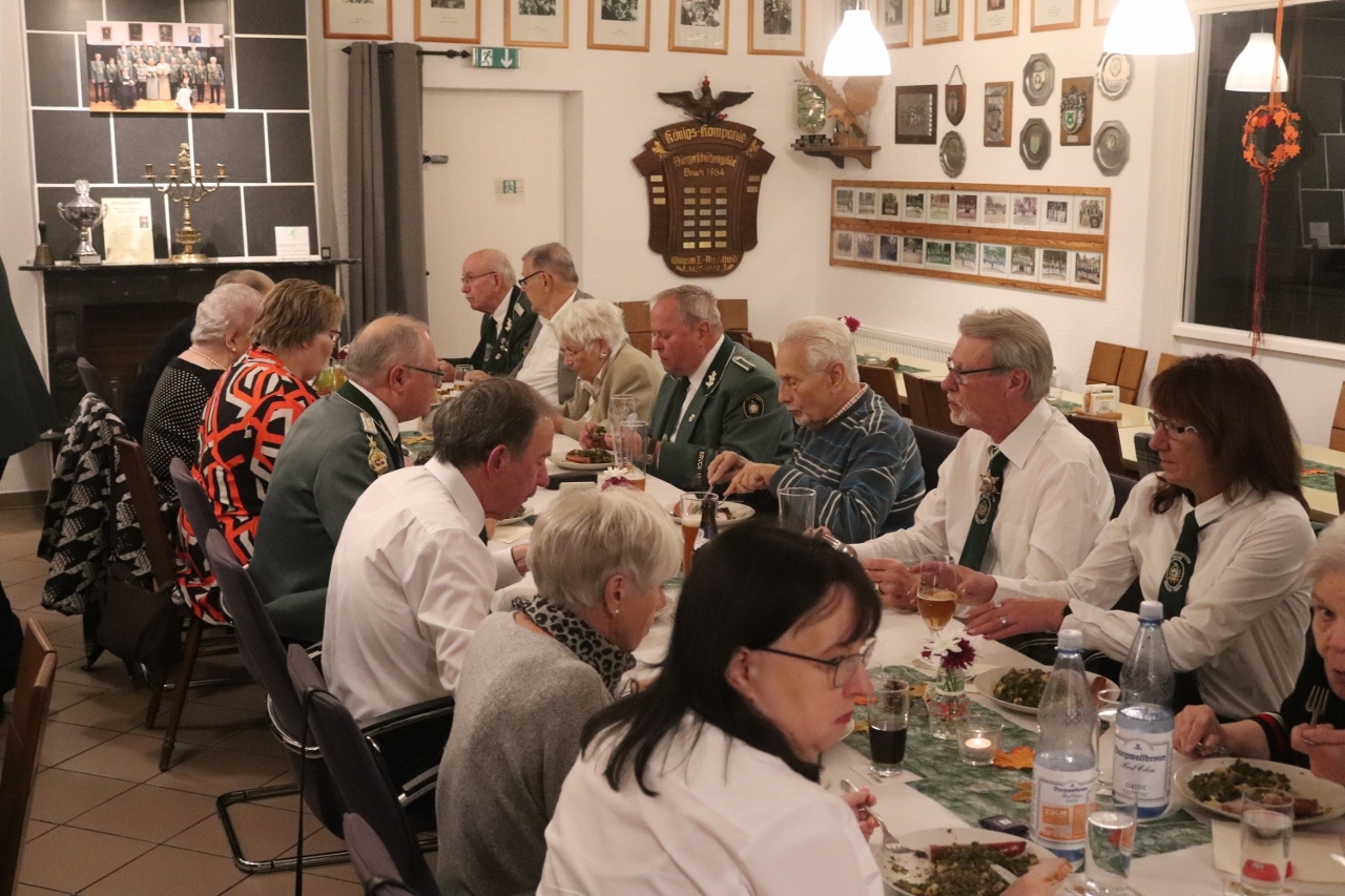 Die Veranstaltung wurde erneut in der bewährten Form durchgeführt. Das bedeutete, dass die grünen Schützenröcke - sofern vorhanden - nach den drei diesjährigen Schützenfesten sowie dem Zapfenstreich zu Ehren unseres scheidenden Bürgermeisters zu einem weiteren Einsatz kommen konnten. Alle Teilnehmerinnen und Teilnehmer konnten sich an diesem Abend zum einen am leckeren Grünkohl erfreuen, zum anderen aber auch an vielen guten und langen Gesprächen. Auch freuten wir uns darüber, dass wir bei dieser gewohnt harmonischen Veranstaltung wieder einige Gäste begrüßen konnten.
